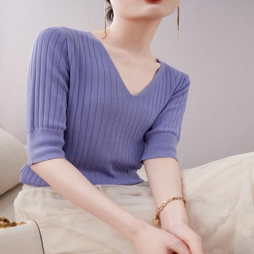 夏季冰丝v领针织短袖t恤女2021年新款五分半袖短款上衣设计感小众热门设计联盟服务商