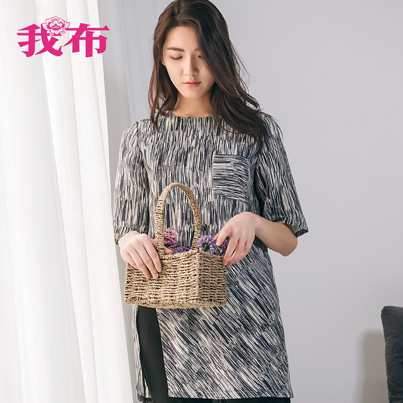 我布新款圆领短袖中长款条纹印花t恤女 休闲简约设计感上衣热门设计联盟服务商